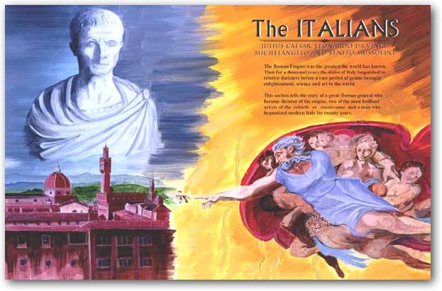 THE ITALIANSJulius Caesar | Leonardo da Vinci | Michelangelo | Benito Mussolini The Roman Empire was the greatest the world has known. Then for a thousand years the states of Italy languished in relative darkness before a rare period of genius brought enlightenment, science and art to the world. This section tells the story of a great Roman general who became dictator of the empire, two of the most brilliant artists of the “rebirth” or “renaissance” and a man who hypnotized modern Italy for twenty years. INTRODUCTIONFew countries have given us so much, for as long, as has Italy. Yet, strictly speaking, there was no “Italy” until about a hundred and fifty years ago — but more about that later. Let’s think about what has come out of this boot-shaped land… Some of the world’s loveliest buildings, music, paintings, sculpture, not to mention its food, wine, language, laws, clothing, highways and the Ferrari sports cars that grace them. The world (especially the USA) has benefited from Italian immigration and laughed, cheered and cried, at and with, its colorful personalities. From its capital, Rome, which is still the center of the Catholic Church, came perhaps the world’s greatest civilization — The Roman Empire. BACKGROUNDThe first civilization in the Italian peninsular was that of the Etruscans who are believed to have come from what is now Turkey, in about 1200 BCE. They dominated Northern Italy (which is still called Tuscany). About 800 BCE the Greeks and Phoenicians (now Lebanese) were in southern Italy. Another tribe, the Latins, dominated the region around the Tiber River in the middle of the country. It was these Latins who first built Rome on seven hills, about 500 BCE. They had no kings, but ran the first republic with elected officials. There were three classes of people. At the top the nobles and landowners (patricians), in the middle the common people or plebians (plebes) and at the bottom, the slaves who had virtually no rights and could neither vote nor fight for their country. By 272 BCE the Latins (or Romans) had defeated the Etruscans and had copied many of the ways of the Greeks, including their belief in multiple gods. The most serious threat to their dominance came from the Phoenician port across the Mediterranean in Carthage on the African coast. The Romans at that time had no navy and the Mediterranean was dominated by Carthaginian businessmen and their powerful navy. In fact Spain and parts of France were Carthaginian possessions. War broke out between Rome and Carthage and this first Punic War lasted 24 years. During this time the Romans improved their navy by copying the Carthaginian vessels. They also figured out a better fighting ship which carried a boarding bridge. HANNIBAL AND ELEPHANTSThen for 23 years there was peace, until the winter of 218 BCE when wild mountain people from the Alps started arriving in Rome. With panic in their eyes and their lips trembling, they told of thousands of brown warriors with strange beasts ‘each as big as a house’ who had emerged from the mountain passes. What they had witnessed was a classic military maneuver carried out by one of the world’s greatest generals — Hannibal (247-183 BCE) With 90,000 soldiers, 12,000 cavalry and 37 fighting elephants he had crossed the mighty Alps. Many soldiers died in this incredible march, which started in Spain and finished as an occupying force in Italy. By outwitting and out-generaling the Romans, Hannibal spent the next 13 years as master of the Italian peninsular. The only portion he never conquered was the city of Rome itself. Eventually worn out by Roman guerrilla tactics, lack of reinforcements and home- sickness he returned to Carthage only to be defeated there by the Romans. He fled to Asia where he committed suicide. Rome later burnt Carthage to the ground and plowed over the ground where it had once stood, scattering salt, so that nothing would grow. With Carthage gone forever, Rome turned its eyes east and conquered Greece and Syria. As it became more powerful, it refined its parliamentary and legal system. “The Republic of Rome” meant there were no kings. In their place were two consuls elected each year by the Senate. The people’s rights were protected. Key elements of Rome’s strength were: